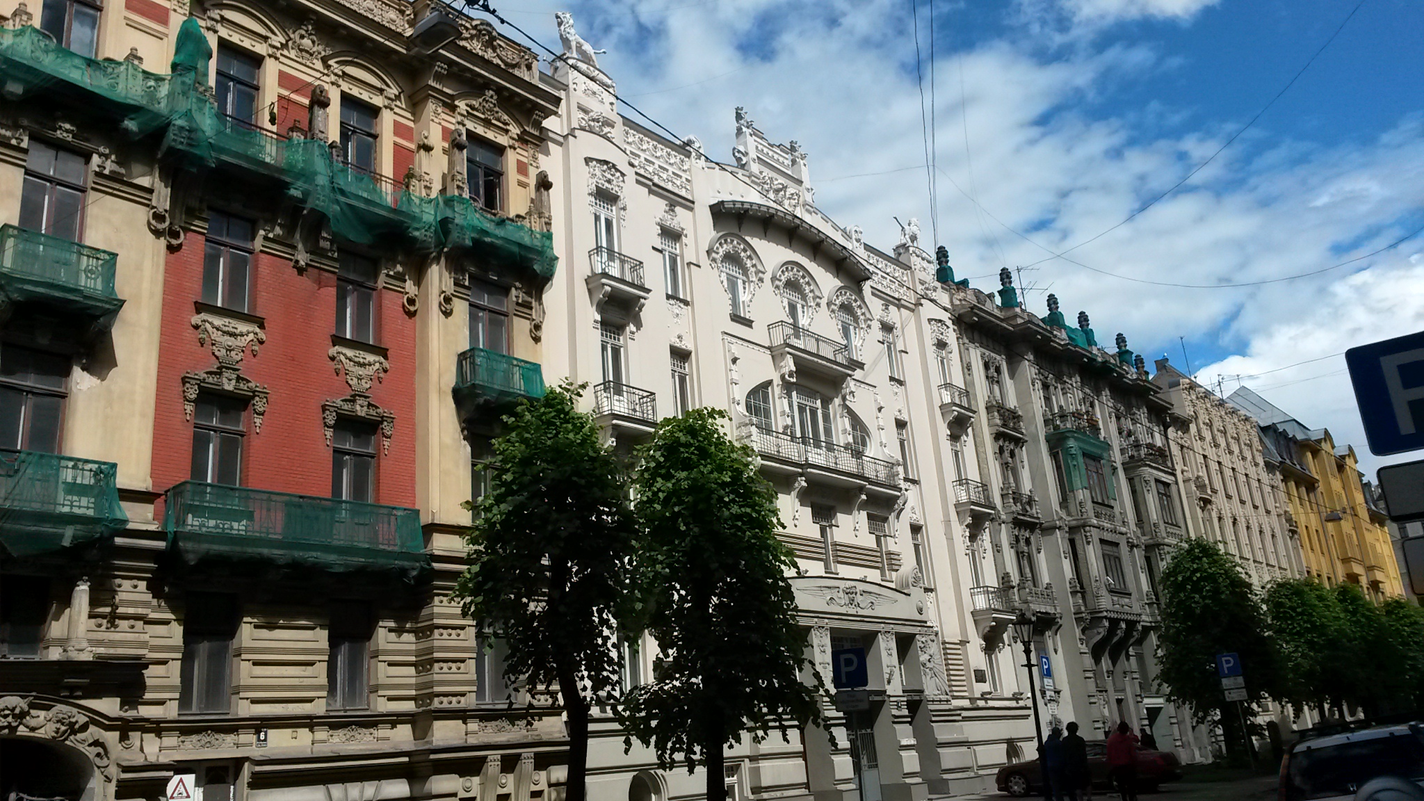 Riga ger ett glest intryck. Nu kan man naturligtvis inte jämföra med Europas riktiga storstäder, men vi undrade ändå lite över var stadens över 700 000 invånare egentligen bor. Och var jobbar de? Några stora industriområden såg vi inte. Det är klart att de finns, men att vi knappt såg några fabriker alls trots att vi åkte runt en del med både buss, tåg och spårvagn, förvånade oss. Och den stora hamnen, med fina naturliga förutsättningar, var helt utan liv. Och varför står så många gamla fina hur och förfaller mitt i centrum? Här ovan syns de fina renoverade jugendhusen på Alberta iela och samma kvarter sett från andra sidan…